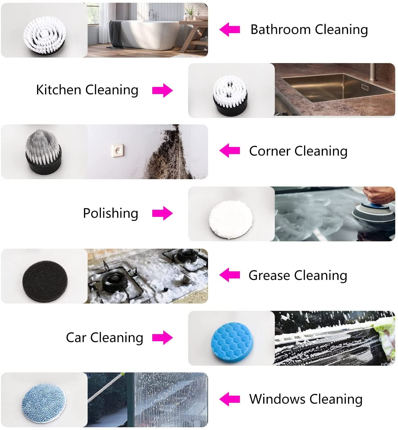 - Multifunctional Cleaner - Includes 8 spin scrubber heads, suitable for cleaning bathroom, bathtub, shower, countertop, stove, sink, glass, cooking bench, tile, tub and so on.