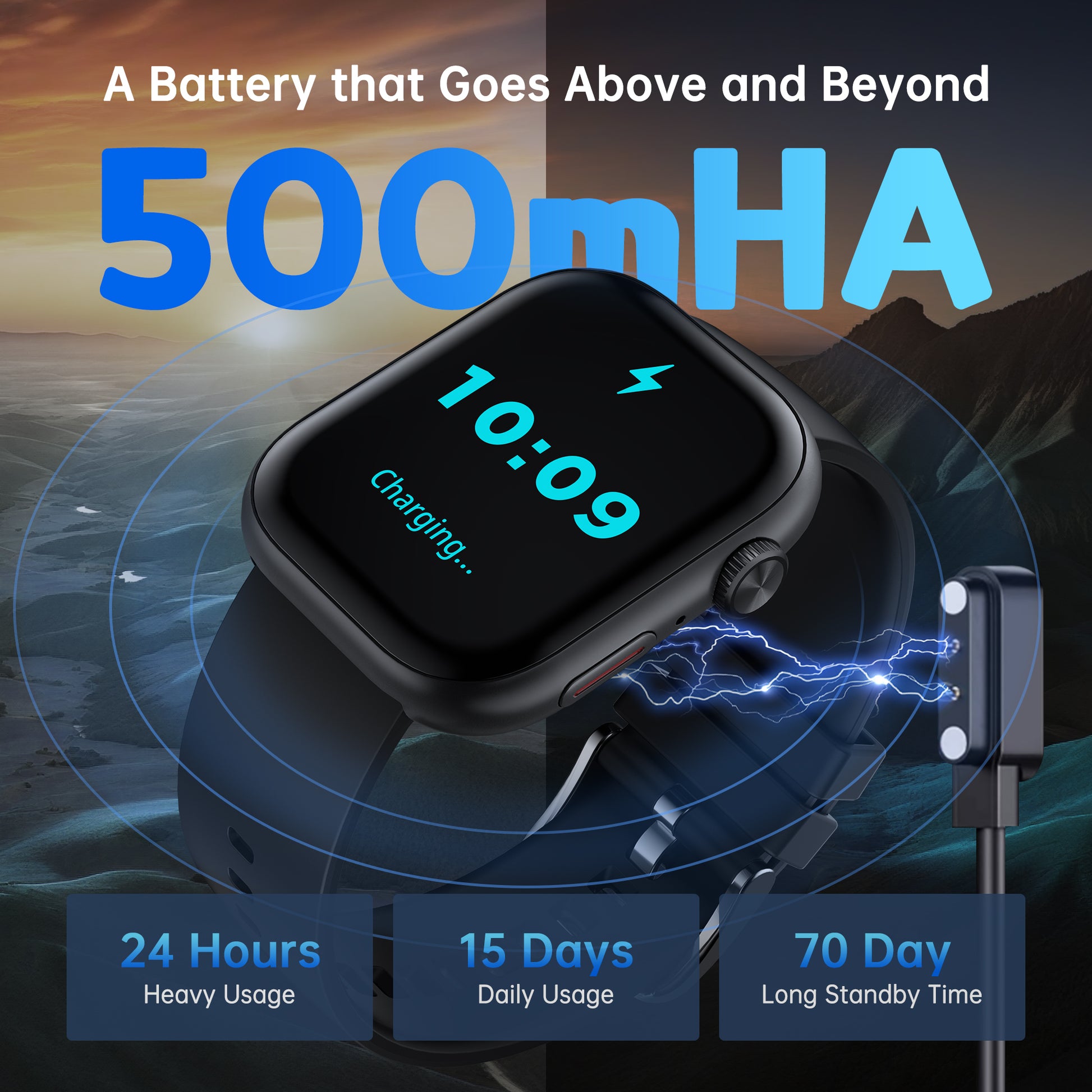 - Watch specifications: Screen size: 2.01 inches Screen resolution: 320X380 System requirements: Support Android 5.0 and above, IOS 9.0 and above mobile phones, support Wireless 4.0 Wireless version: 5.3 Battery capacity: 500mAh Life time: Up to 7-10 Days of use, 45 Days of standby Waterproof grade: IP68 Strap material: silicone Watch packaging: smart watch x1, charging cable x1, manual x1