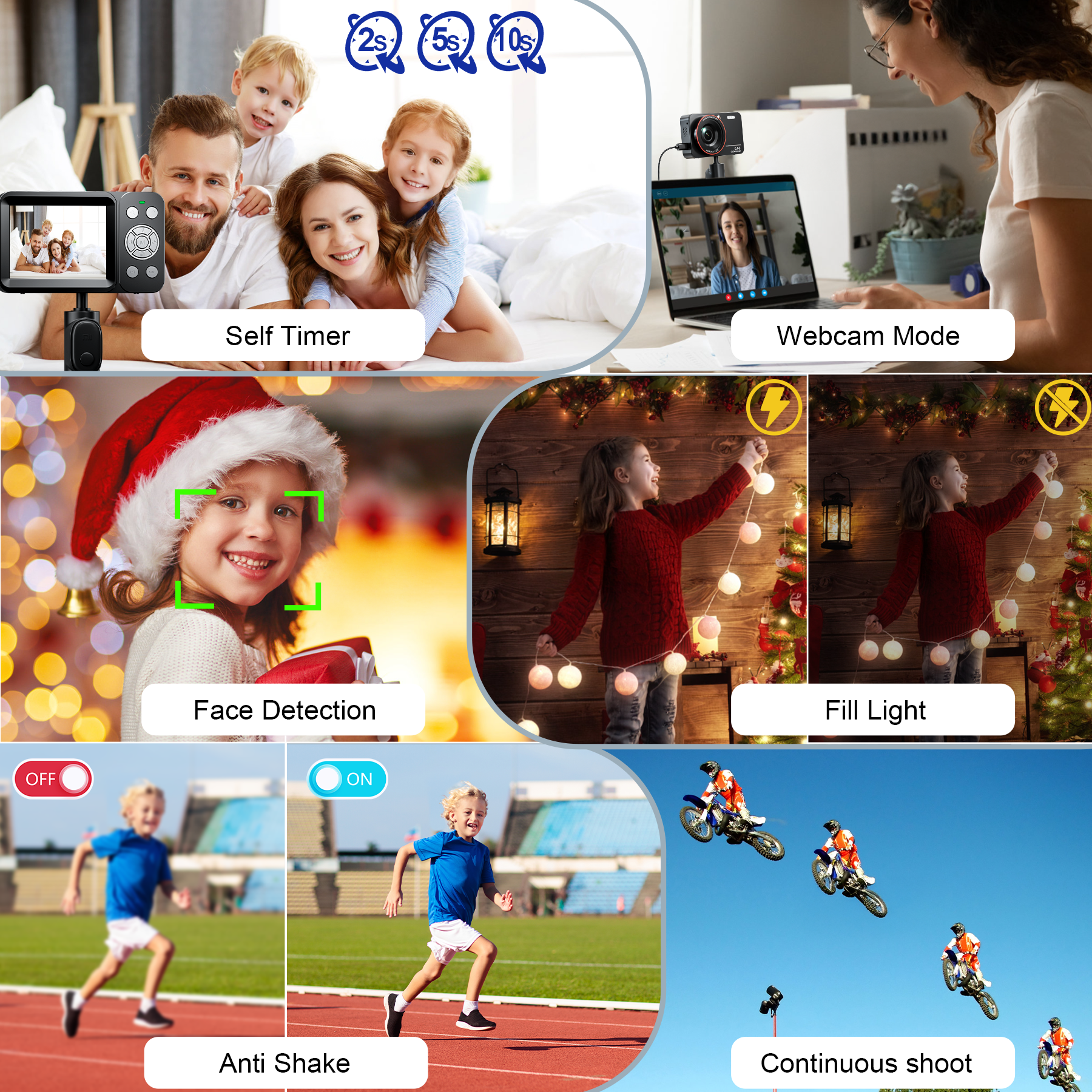 - 【Vlog Webcam and Upgraded Fill Light】The digital camera with video can be used as a live webcam, the pause function allows you to pause while recording. Built in 3 flash bulbs make the illumination brighter, helping you take clear photos even in low light.