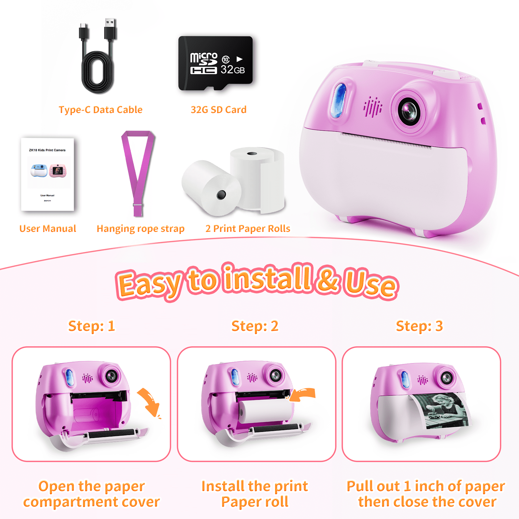 - 【No Ink Instant Print Camera For Kids】This kids instant camera uses advanced thermal printing technology to print without toner. The printing paper is made of virgin wood pulp, without any harmful ingredients, safe, durable, easy to tear,no ink or toner required, simple, fast and efficient printing.
